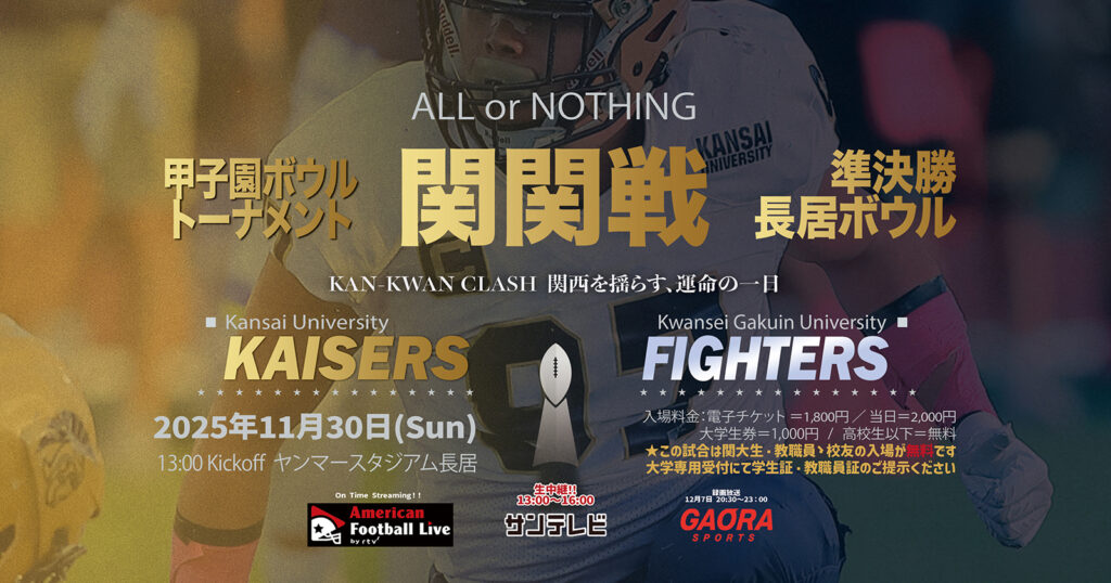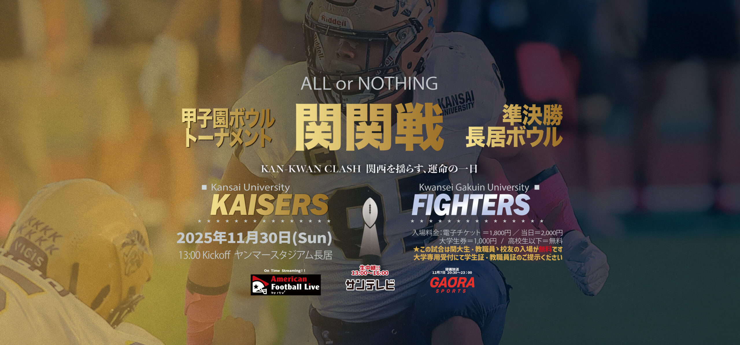 2025 全日本大学アメリカンフットボール選手権 準決勝関西大学 KAISERS vs 関西学院大学 FIGHTERS2025年11月30日(日) 13:00 キックオフ ヤンマースタジアム長居 「毎... -