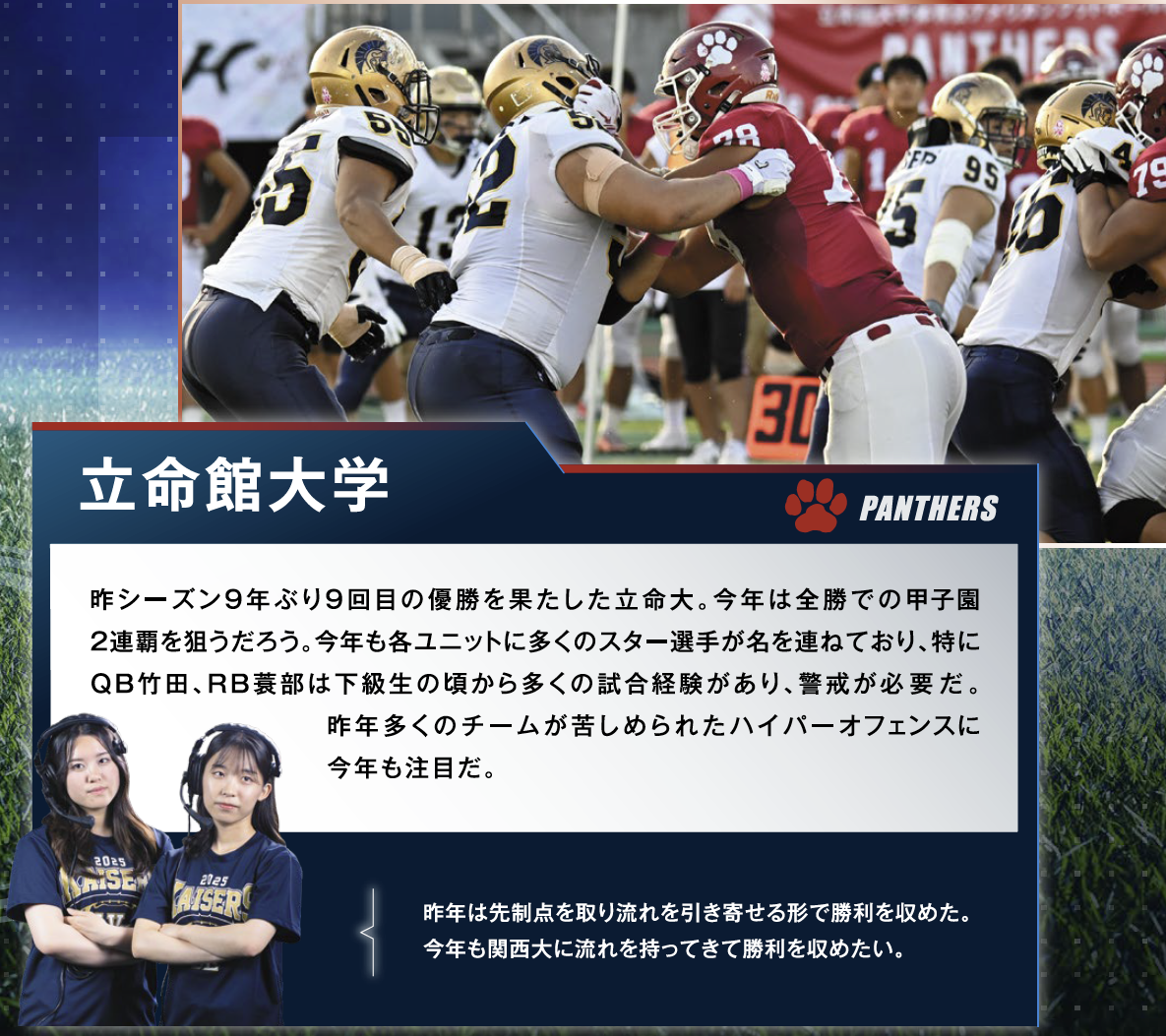 2025 関西学生アメリカンフットボールリーグ Div 1 第 6 節関西大学 KAISERS vs 立命館大学 PANTHERS2025年10月26日(日) たけびしスタジアム京都 15時 KICKOFF 分析班からのコメント お気に入り NEWS vs 関西学院大学 Fighters 関連記事 vs 関西学院大学 Fighters 2025年9月27日 vs 甲南大学 RedGang 2025年9月20日 vs 同志社大学 Wildrover 2025年9月6日 カイザーズフラッグからのお知らせ 2025年9月4日 2025年度秋シーズンのお知らせ 2025年8月28日 新スローガン決定のお知らせ 2025年6月1日 新幹部決定のお知らせ 2025年6月1日 新監督就任のお知らせ 2025年5月29日