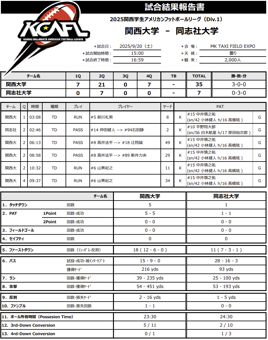 2025 関西学生アメリカンフットボールリーグ Div 1 第3節関西大学 KAISERS vs 同志社大学 Wildrover2025年9月20日(土) MK TAXI FIELD EXPO 15時 KICKOFF 分析班からのコメント お気に入り NEWS カイザーズフラッグからのお知らせ vs 甲南大学 RedGang 関連記事 vs 神戸大学 RAVENS 2025年10月26日 WE ARE 12. ファンと一年生がまとう特別な番号 2025年10月17日 vs 立命館大学 PANTHERS 2025年10月14日 vs 関西学院大学 Fighters 2025年9月27日 vs 甲南大学 RedGang 2025年9月20日 カイザーズフラッグからのお知らせ 2025年9月4日 2025年度秋シーズンのお知らせ 2025年8月28日 新スローガン決定のお知らせ 2025年6月1日