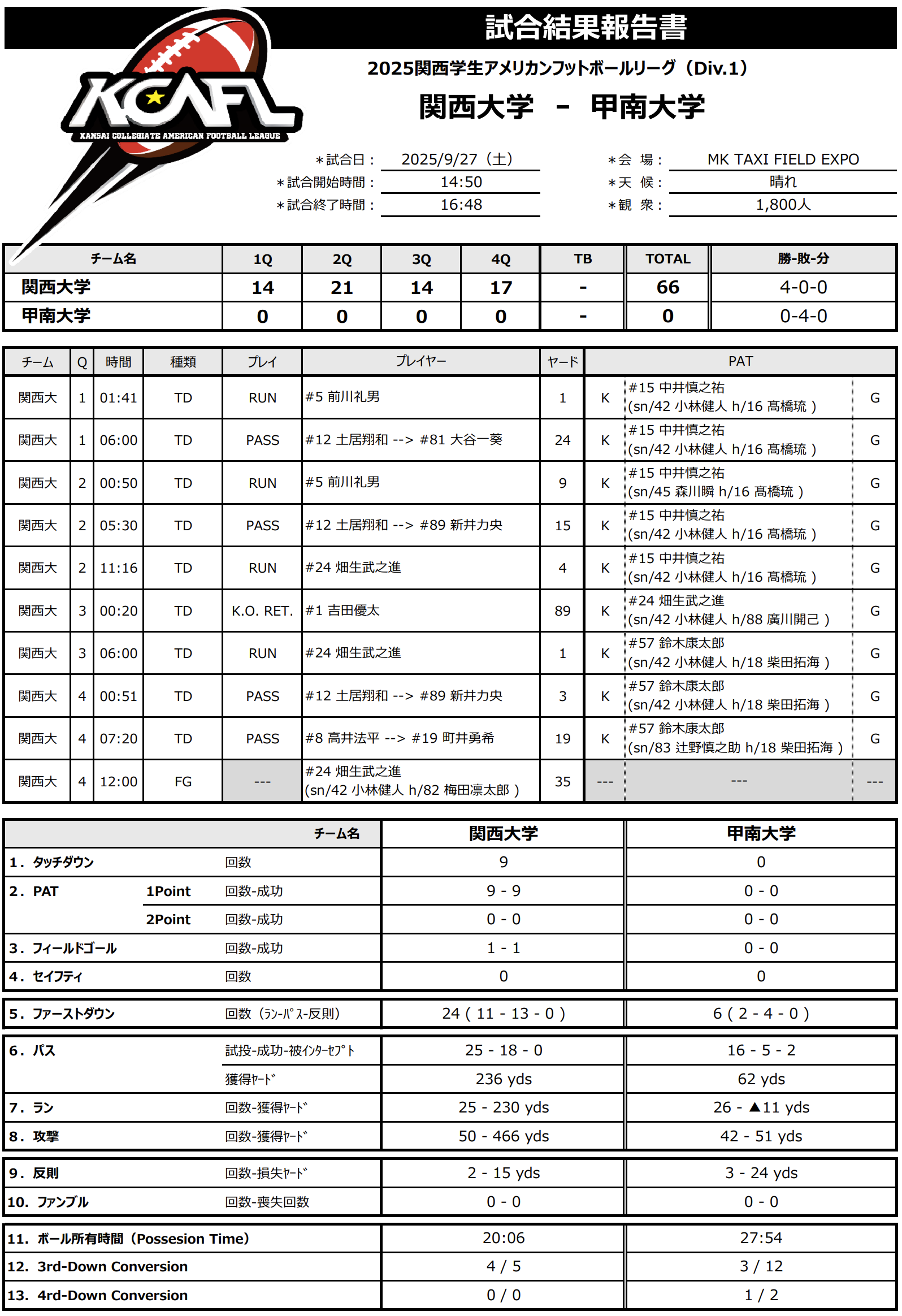 2025 関西学生アメリカンフットボールリーグ Div 1 第4節