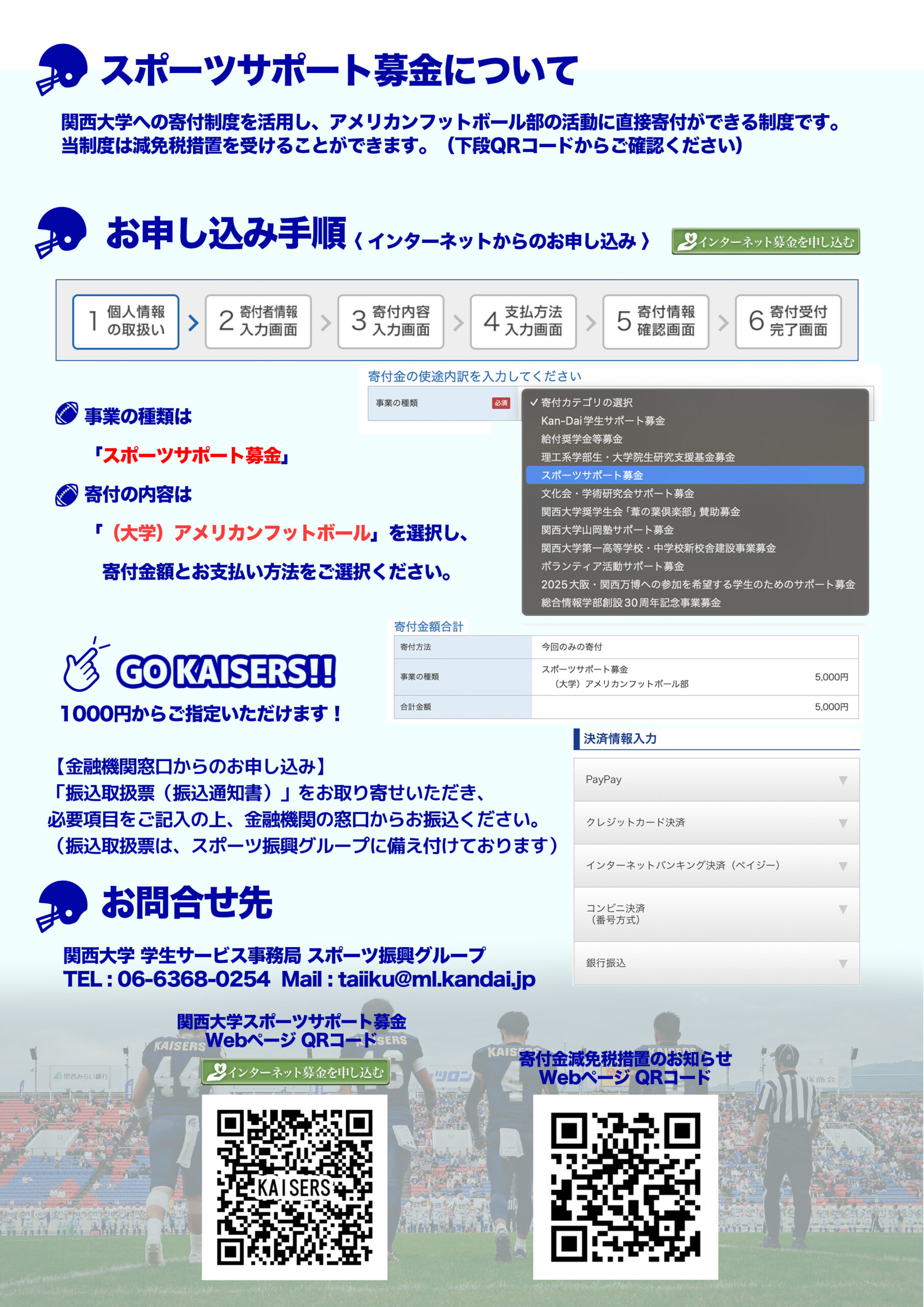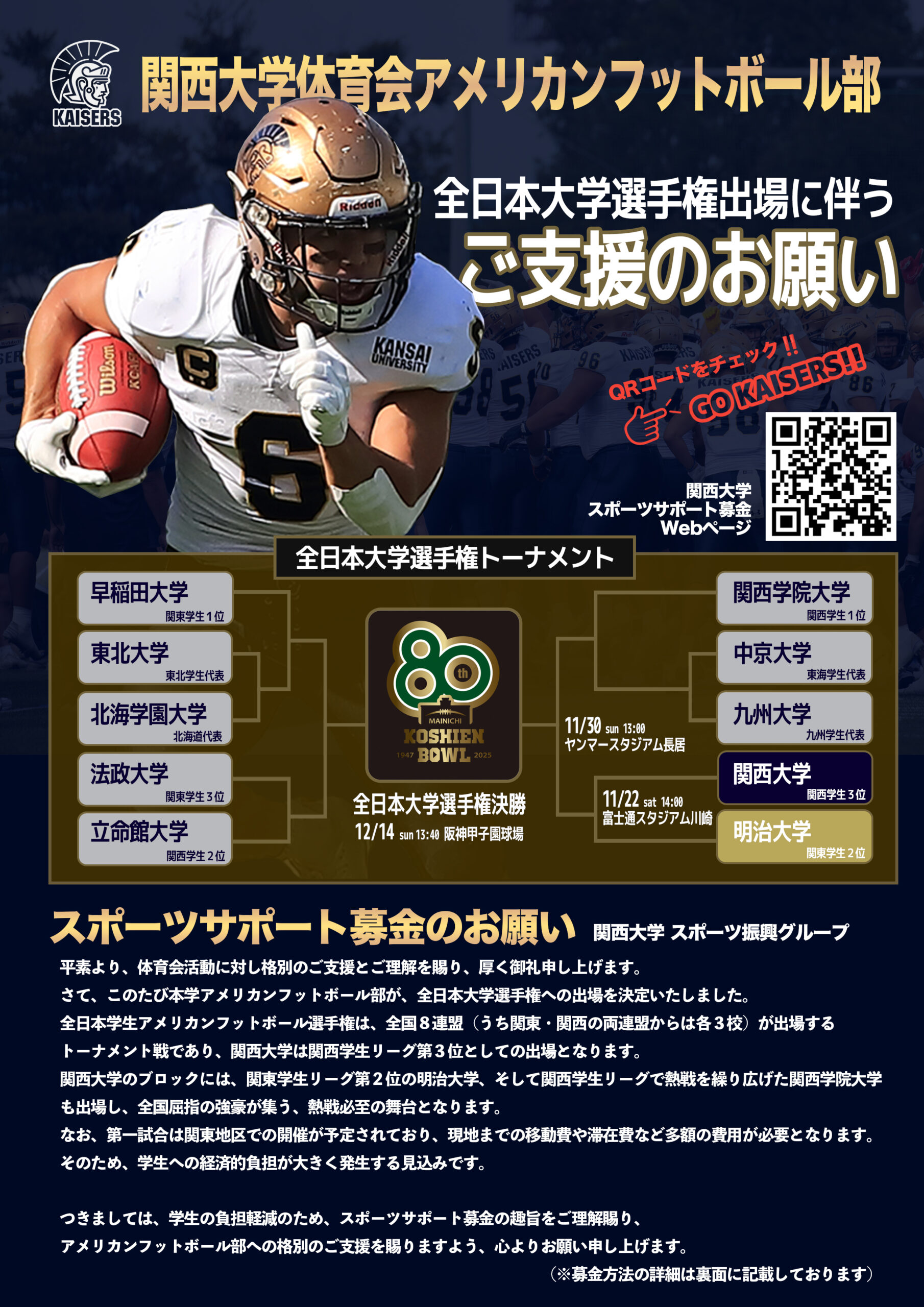 つきましては、学生の負担軽減のため、スポーツサポート募金の趣旨をご理解賜り、 アメリカンフットボール部への格別のご支援を賜りますよう、心よりお願い申し上げます。